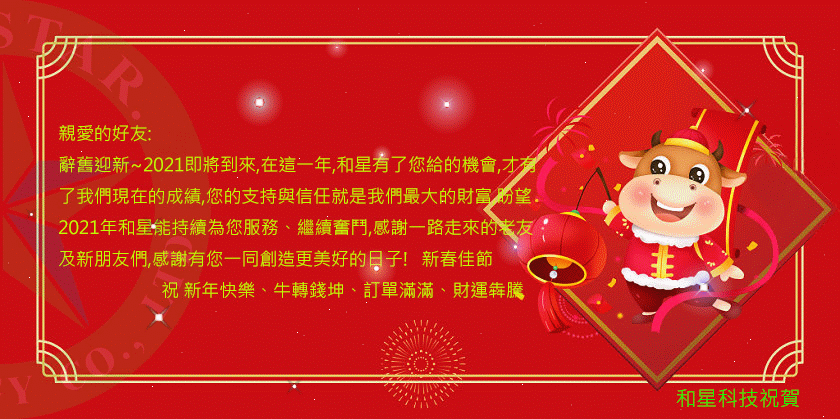 感謝您一直以來對和星科技的支持與關照,本公司春節假期將訂於2021年2月9日(二)至2月17日(三),繼續為大家提供服務,恭賀大家新春佳節愉快!闔家平安!