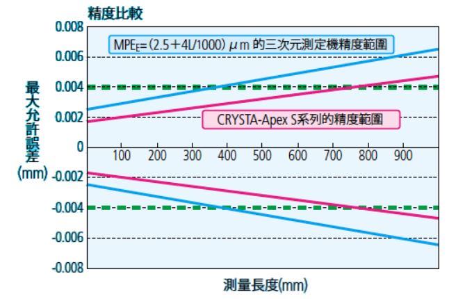 三豐三次元測定機Mitutoyo CMM Crysta-Apex S系列最大允許誤差*1為E0,MPE=(1.7+3L/1000) μm,是一種高精度CNC三次元測定機、三次元量測儀。