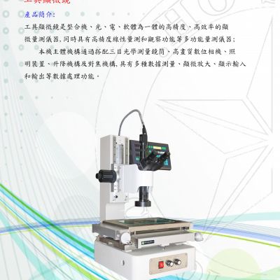 工具顯微鏡是整合機、光、電、軟體為一體的高精度、高效率的顯微量測儀器,同時具有高精度線性量測和觀察功能等多功能量測儀器;本機主體機構通過搭配三眼光學量測鏡筒、高畫質數位相機、照明裝置、升降機構及對焦機構,具有多種數據量測、顯微觀察、顯示輸入和輸出等數據處理功能。
